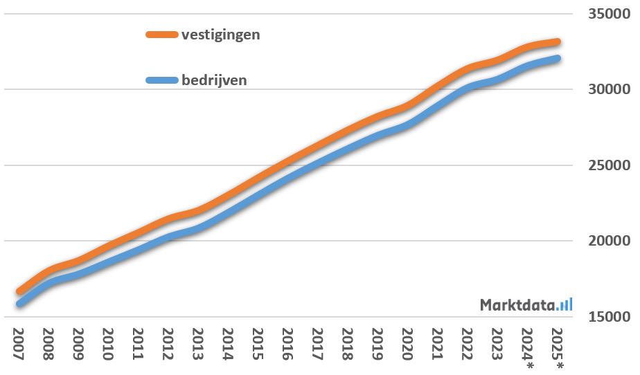 Een bedrijf kan meerdere vestigingen hebben. Onderstaand figuur toont de ontwikkeling van het aantal bedrijven en het aantal vestigingen van bedrijven in de kappersbranche volgens cijfers van het CBS (SBI-code 96021).