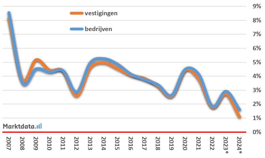 Onderstaand figuur toont de procentuele mutatie per jaar van het aantal bedrijven en het aantal vestigingen van bedrijven in de kappersbranche volgens cijfers van het CBS (SBI-code 96021).