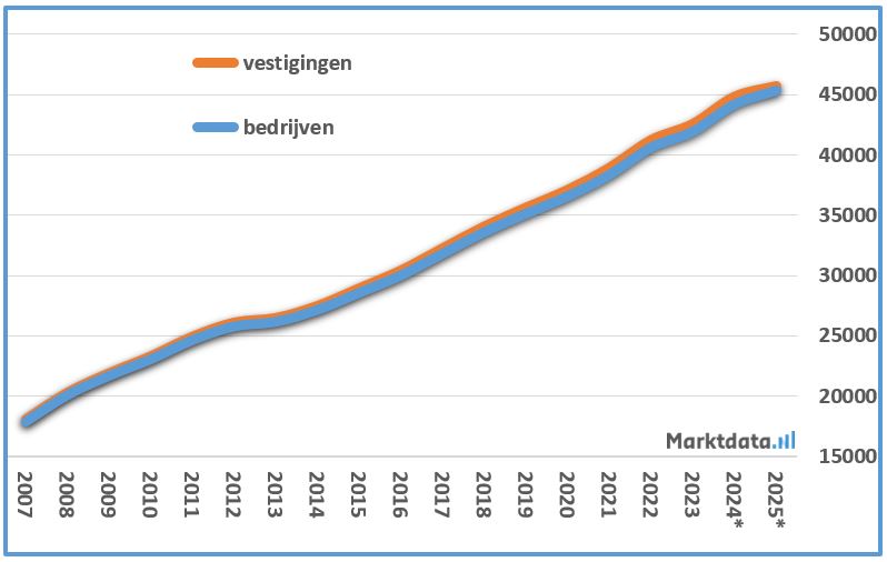 Een bedrijf kan meerdere vestigingen hebben. Onderstaand figuur toont de ontwikkeling van het aantal bedrijven en het aantal vestigingen van bedrijven in de schoonheidsverzorging volgens cijfers van het CBS (SBI-code 96022).
