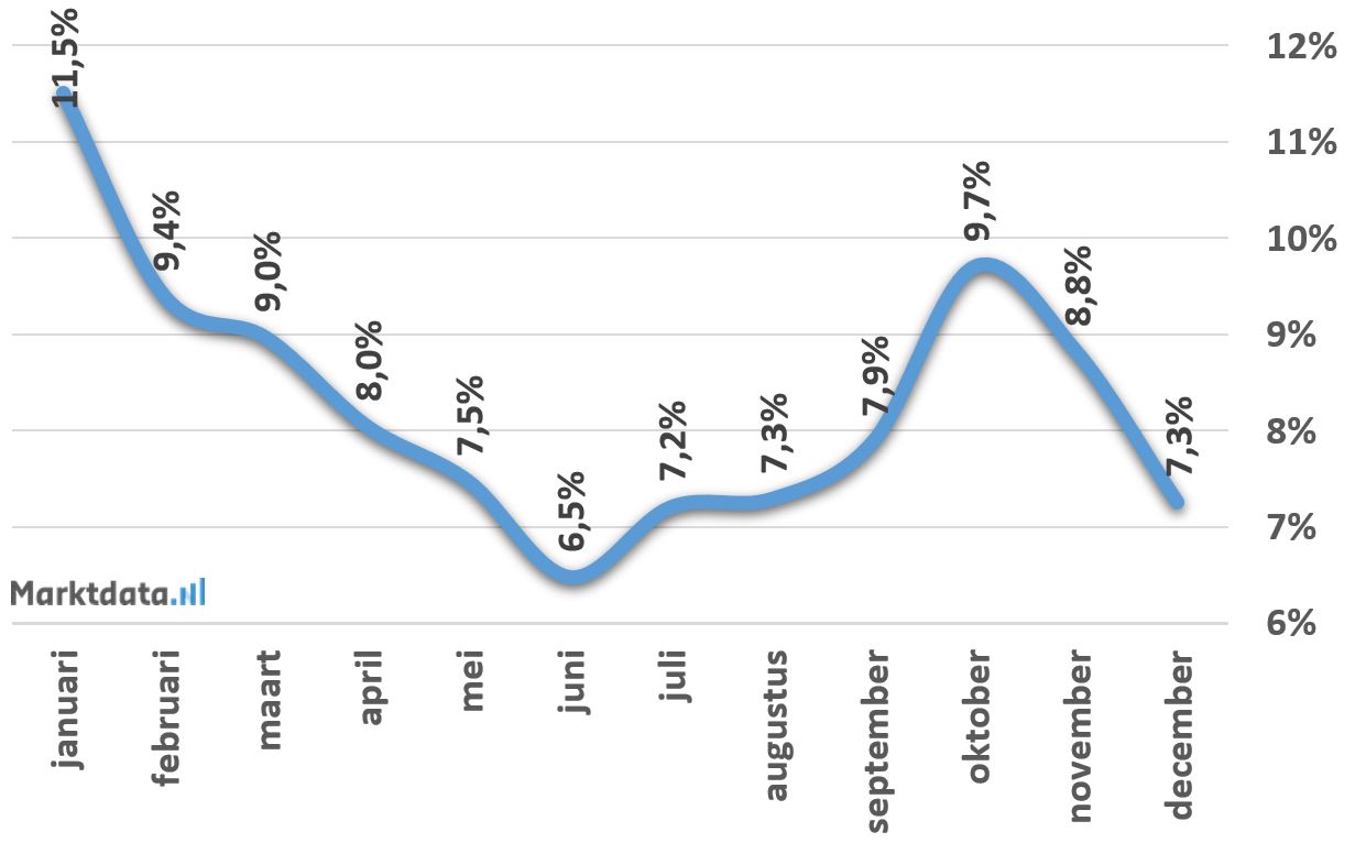 Het maandelijkse zoekvolume gerelateerd aan behang fluctueert sterk. Op het hoogtepunt, januari 2022, werden er ruim 1,6 miljoen gerelateerde zoekopdrachten uitgevoerd op het gebied van behang. Het zoekvolume van de zoekopdrachten gerelateerd aan behang over de afgelopen vier jaar is tevens per maand geanalyseerd. Hierbij is gemeten hoe groot het zoekvolume-aandeel per maand is over de afgelopen vier jaar. Indien er iedere maand evenveel wordt gezocht, dus gelijkmatig over het hele jaar verdeeld, dan zou het maandelijkse aandeel in het zoekvolume 8,3% zijn (100%/12 maanden). Onderstaand figuur toont het aandeel van het jaarlijkse zoekvolume per maand van zoekopdrachten gerelateerd aan behang over de afgelopen vier jaar. Daaruit valt af te lezen dat het zoekvolume in de zomerperiode relatief beperkt is. In de maand januari wordt er het meest gezocht naar behang. Deze maand vertegenwoordigt 11,5 procent van het jaarlijkse zoekvolume. Ook in de periode februari t/m april en de maanden oktober en november wordt er relatief veel naar behang gezocht.