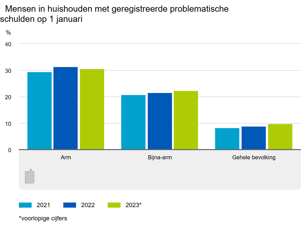 Arme mensen hebben 3 keer zo vaak als gemiddeld te maken met problematische schulden, bijna-arme 2 keer. Vergeleken met 2021 is het aandeel met problematische schulden in beide groepen-en in de bevolking – toegenomen. De toename was iets groter bij de bijna-armen. Dit komt doordat problematische schulden veel voorkomen onder bijstandsontvangers (29 procent in 2023) en zij door de energietoeslag een groter deel zijn gaan uitmaken van de bijna-armen. Zo kwam de helft van de bijstandsontvangers die in 2021 arm waren in 2022 net boven de armoedegrens uit. Een jaar eerder was dat 30 procent.