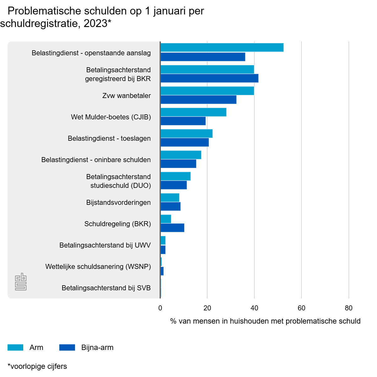 Huishoudens kunnen in meerdere schuldregistraties voorkomen. Dat is bij de helft van de bijna-arme mensen het geval, en bij 42 procent van de arme mensen. In de arme bevolking met problematische schulden had iets meer dan de helft een openstaande aanslag bij de Belastingdienst, 40 procent stond met een betalingsachterstand geregistreerd bij het BKR en een even groot deel had een betalingsachterstand bij de zorgpremie. Bijna-arme mensen hadden het vaakst te maken met een betalingsachterstand geregistreerd bij het BKR (42 procent). Daarna volgden een nog openstaande aanslag bij de Belastingdienst (36 procent) en achterstand bij het betalen van de zorgpremie (33 procent).