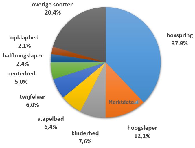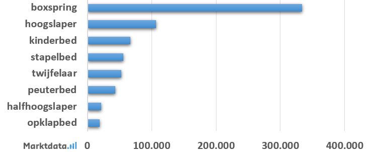 Bijna 38 procent van het zoekvolume met type bed aanduiding heeft betrekking op boxsprings. Op de tweede plaats staat de hoogslaper met een aandeel van ruim 12 procent in het zoekvolume. Op drie staat het kinderbed, dat 7,6 procent van het zoekvolume vertegenwoordigt.