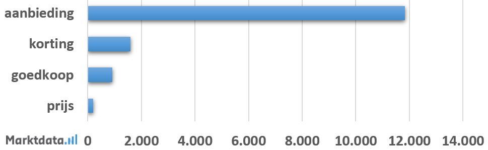 Het meest wordt er gezocht met de zoekterm “aanbieding” in de zoekopdracht. Dit woord komt gemiddeld ruim 11.800 keer per maand voor in de zoekopdrachten. Daarnaast worden de woorden “korting”, “goedkoop” of “goedkope” frequent gebruikt.