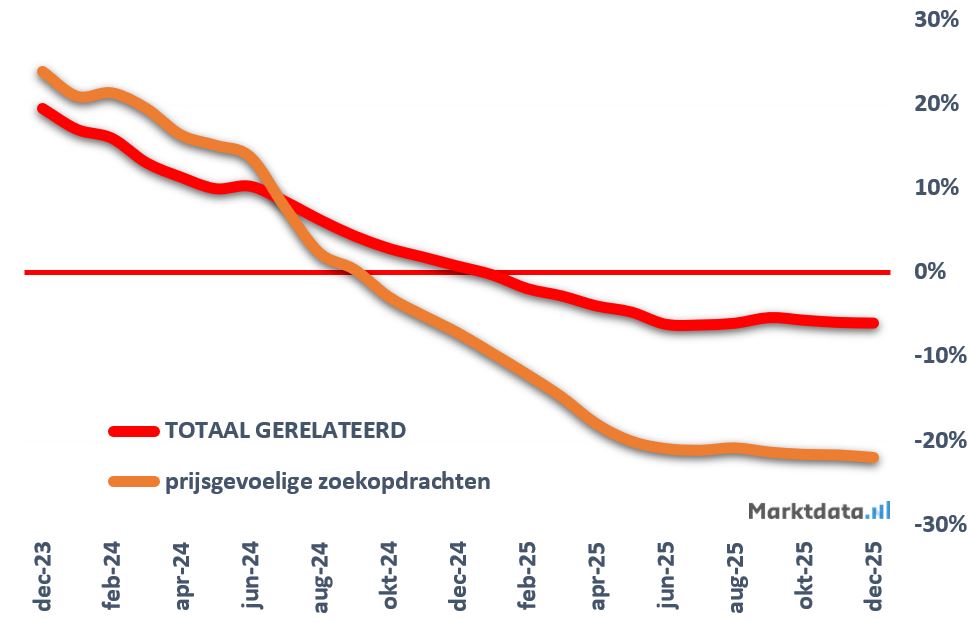 Onderstaand figuur toont de voortschrijdende procentuele jaarmutatie van het aantal prijsgevoelige zoekopdrachten naar voedingssupplementen. Gesteld kan worden dat de consument tot medio 2024 steeds meer prijsgevoelig zocht naar voedingssupplementen. De procentuele groei van het aantal zoekopdrachten van voedingssupplementen was structureel lager dan dat van prijsgerichte zoekopdrachten op het gebied van voedingssupplementen. Sinds augustus 2024 is de consument echter steeds minder prijsgericht gaan zoeken.
