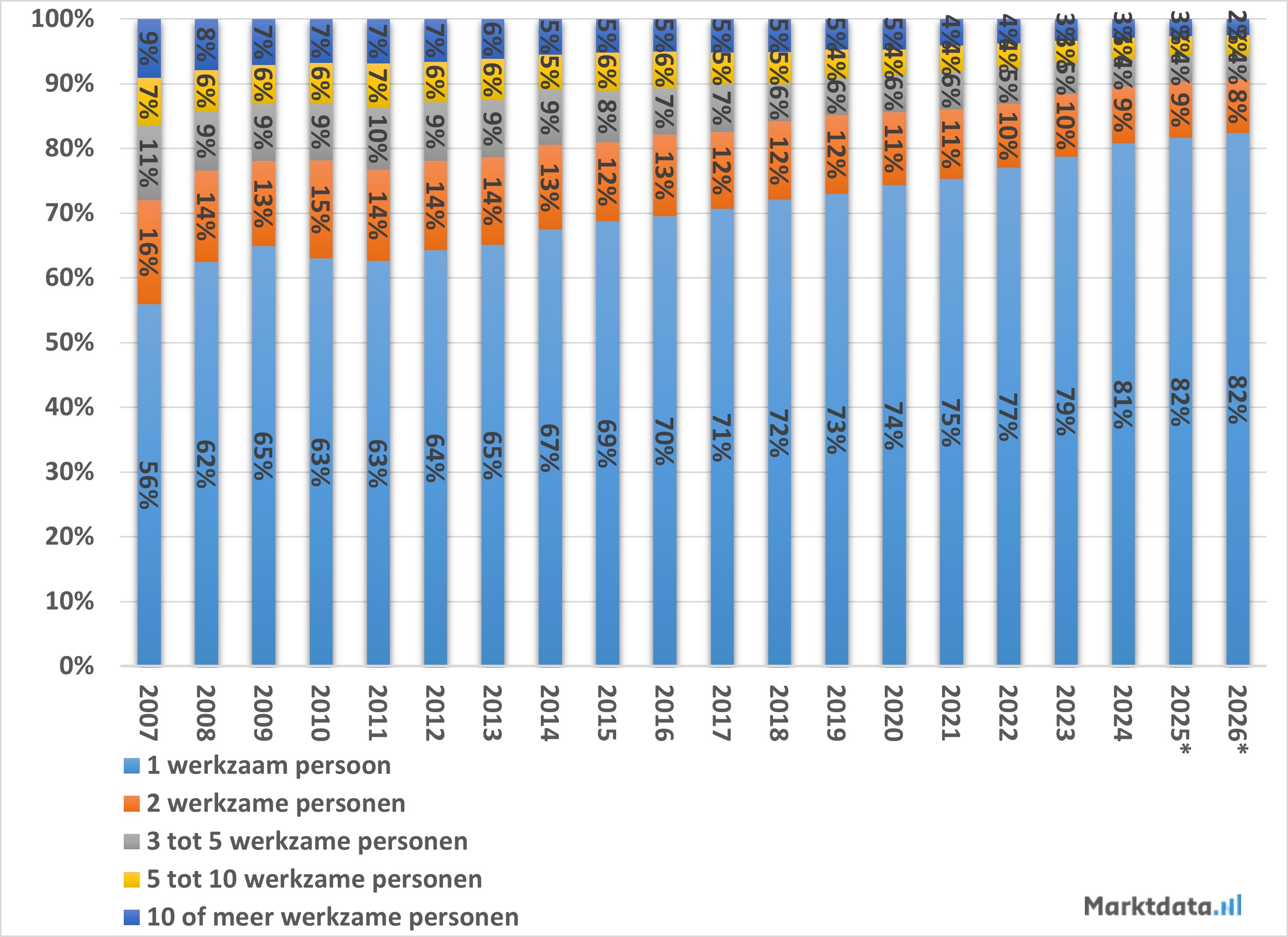 Het aandeel van bedrijven in de onderscheiden categorieën aantal werkzame personen laat een geleidelijke verschuiving zien over de afgelopen jaren. Het aandeel bedrijven met slechts één werkzaam persoon is van 56 procent in het jaar 2007 toegenomen tot 82 procent in het jaar 2026. De groei van het aantal bedrijven betreft derhalve voornamelijk kleine zelfstandigen.