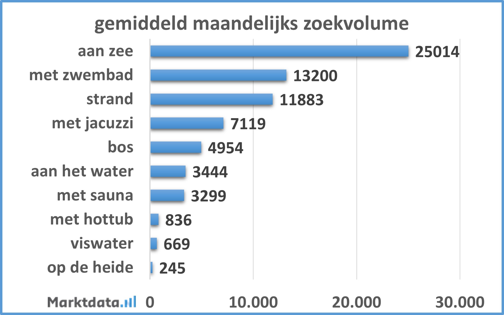 Wat zijn de meest gezochte omgevingsvereisten en faciliteiten in relatie tot een type vakantiebeleving gekoppeld aan campings en vakantieparken? Onderstaand figuur toont het gemiddeld aantal maandelijkse zoekopdrachten, gemeten over de afgelopen vier jaar van de top-10 van belangrijkste omgevingsvereisten en faciliteiten.