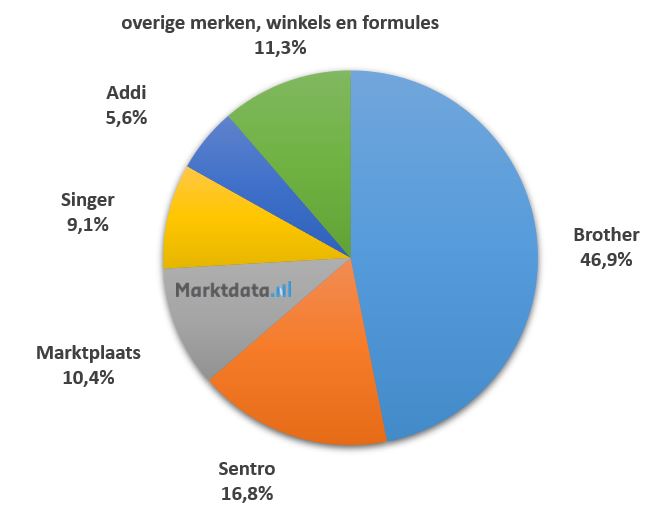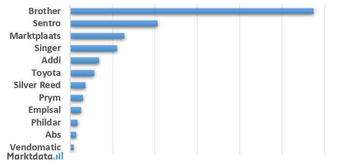 46,9 Procent van het zoekvolume naar merken, winkels en winkelformules op het gebied van breimachines komt voor rekening van Brother. Daarmee is Brother duidelijk marktleider op het gebied van breimachines. Op de tweede plaats staat Sentro met 16,8 procent van het zoekvolume, gevolgd door Marktplaats met 10,4 procent.