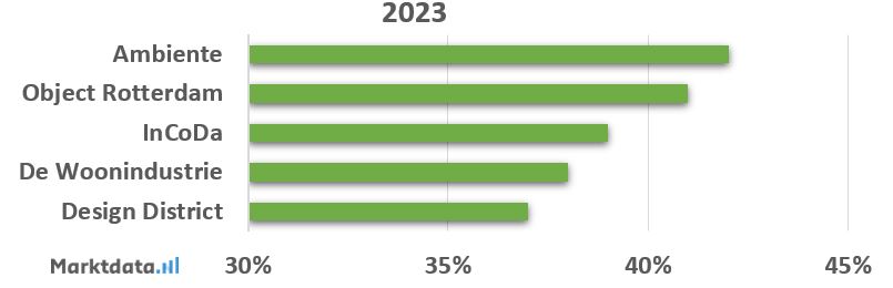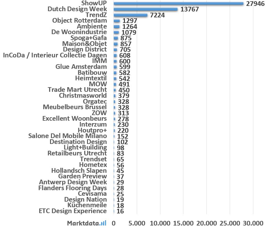 Op basis van het online zoekvolume via de Google zoekmachine ontstaat het volgende figuur qua meest gezochte vakbeurzen. Hierbij dient te worden opgemerkt dat de cijfers niet alleen betrekking hebben op woondetaillisten. Hoe breder een vakbeurs zich in de markt zet, en zeker ook als consumenten welkom zijn op een beurs, dan heeft een beurs al gauw een groter zoekvolume dan een vakbeurs in een nichemarkt met alleen zakelijke bezoekers.