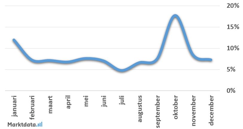Het zoekvolume van de zoekopdrachten gerelateerd aan woonvakbeurzen over de afgelopen vier jaar is tevens per maand geanalyseerd. Hierbij is gemeten hoe groot het zoekvolume-aandeel per maand is over de afgelopen vier jaar. Indien er iedere maand evenveel wordt gezocht, dus gelijkmatig over het hele jaar verdeeld, dan zou het maandelijkse aandeel in het zoekvolume 8,3% zijn (100%/12 maanden). Onderstaand figuur toont het aandeel van het jaarlijkse zoekvolume per maand van zoekopdrachten gerelateerd aan woonvakbeurzen over de afgelopen vier jaar. Daaruit valt af te lezen dat het zoekvolume in de maanden januari en oktober sterk boven gemiddeld is. In de maand oktober wordt er het meest gezocht naar woonvakbeurzen. Deze maand vertegenwoordigt 17,7 procent van het jaarlijkse zoekvolume. In de zomermaanden wordt er relatief weinig naar woonvakbeurzen gezocht.