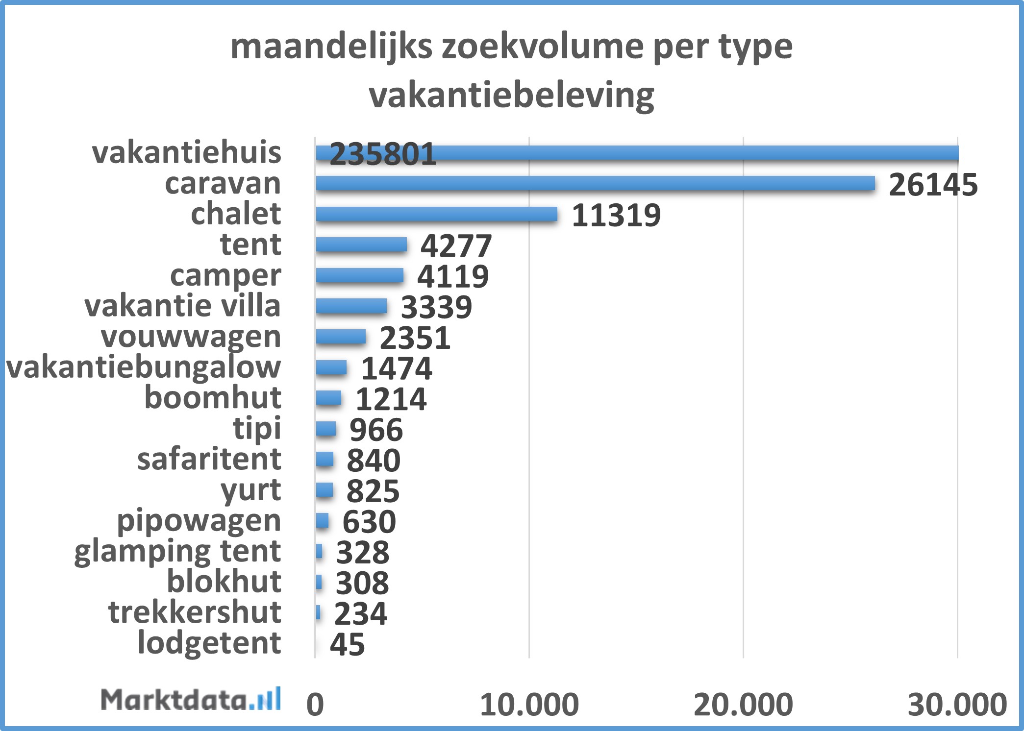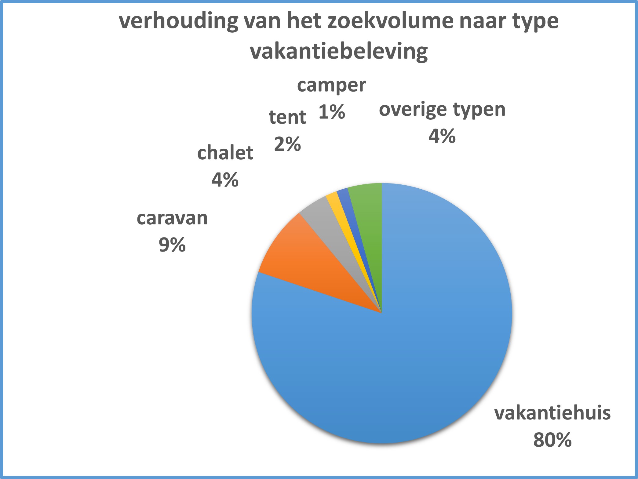 De afgelopen vier jaar werd er veruit het meest gezocht naar een vakantiehuis. Dit heeft dus ook betrekking op vakantiehuizen buiten een camping of vakantiepark, omdat dit technisch niet goed te scheiden is. Gemiddeld werd er per maand ruim 235.000 keer via de Google zoekmachine gezocht naar een vakantiehuis. Dit zijn zoekopdrachten gerelateerd aan campings en vakantieparken met de term “vakantiehuis” er in. Goede tweede is de caravan met maandelijks ruim 26.000 zoekopdrachten. Naar een verblijf in een chalet werd gemiddeld ruim 11.000 keer per maand gezocht. De tent staat op de vierde plaats. Hierbij kan wel worden vermeld dat indien met wil gaan kamperen met een tent, men veelal zoekt naar een camping en niet zo snel gaat zoeken met de zoekterm “tent” in de zoekopdracht. Daarna volgt een lijst met typen vakantiebeleving die beduidend minder frequent worden gezocht. De procentuele verdeling van de belangrijkste typen vakantiebeleving ziet er als volgt uit.
