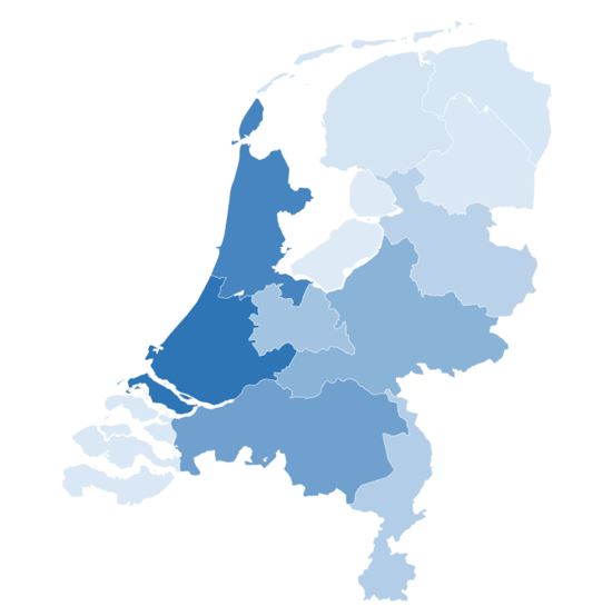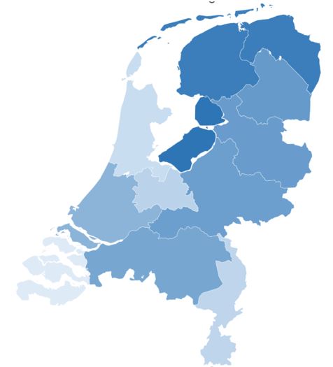 Onderstaand figuur geeft geografisch weer in welke provincies de meeste fysiotherapiepraktijken zijn gevestigd. Hoe blauwer een provincie is gekleurd, des te meer fysiotherapiepraktijken er zijn gevestigd.