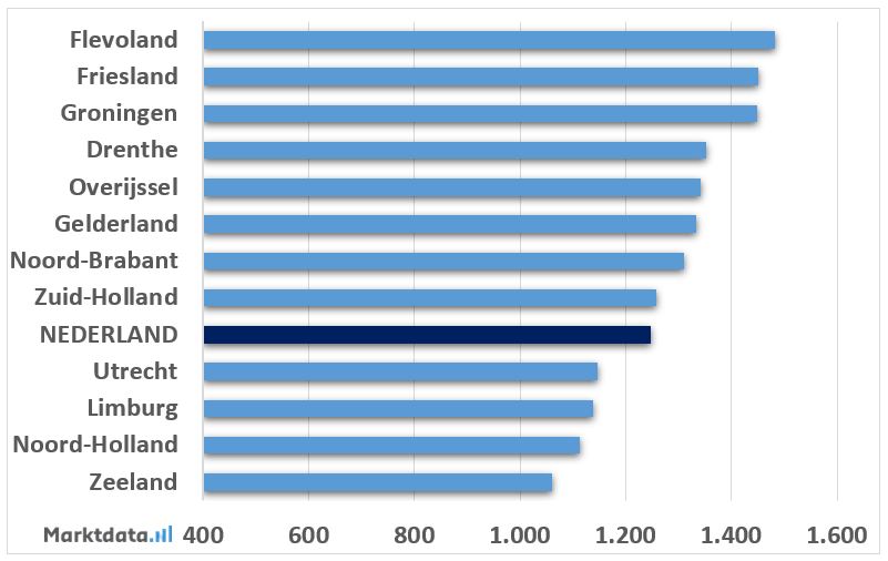Zeeland en Noord-Holland zijn het minst blauw gekleurd. Dit komt door het grote aantal fysiotherapiepraktijken in verhouding tot het inwoneraantal van deze provincies. De provincie Flevoland telt met 1.483 inwoners per vestiging het grootste aantal inwoners per fysiotherapiepraktijk. In Zeeland is het aantal inwoners per fysiotherapiepraktijk (1.061) het kleinst. Het landelijk gemiddelde komt uit op 1.248 inwoners per fysiotherapiepraktijk. Onderstaande figuur toont de ranglijst van het aantal inwoners per fysiotherapiepraktijk per provincie.