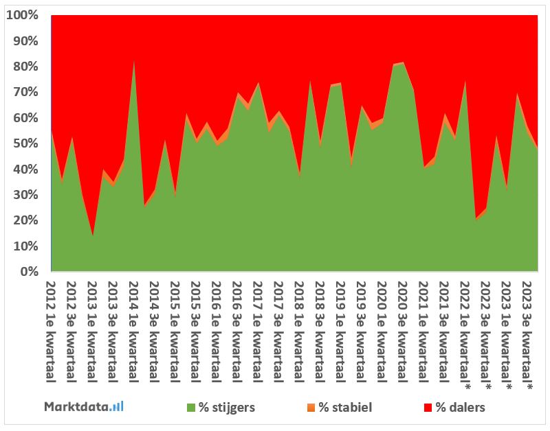 Het CBS registreert per kwartaal het aandeel van tuincentra met een omzetstijging, daling en met een stabiele omzet. Onderstaand figuur toont de ontwikkelingen per kwartaal vanaf het eerste kwartaal van 2012 t/m het vierde kwartaal van 2023. Per saldo zijn er in de meeste kwartalen meer stijgers dan dalers. Dat was in de jaren 2012-2014 niet het geval.