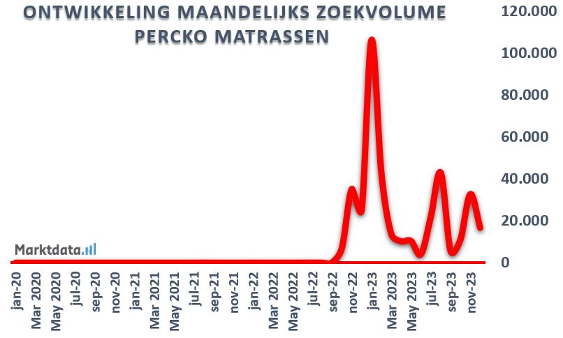 We zien een zeer sterke groei van het online zoekvolume naar matrassen van PERCKO in de afgelopen paar jaar. In januari 2023 zien we een sterke piek in het online zoekvolume van meer dan 106.000 zoekopdrachten. Wel is het zo dat het zoekvolume sindsdien sterk fluctueert.