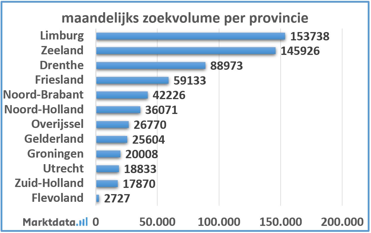 De afgelopen vier jaar werd er het meest gezocht naar een vakantiebestemming in de provincie Limburg. Gemiddeld werd er per maand ruim 153.000 keer via de Google zoekmachine gezocht naar een vakantie in Limburg. Dit zijn zoekopdrachten gerelateerd aan vakanties in het eigen land met de term “Limburg” er in. Goede tweede is de provincie Zeeland met maandelijks ruim 145.000 zoekopdrachten. Naar een vakantie in Flevoland werd het minst gezocht.