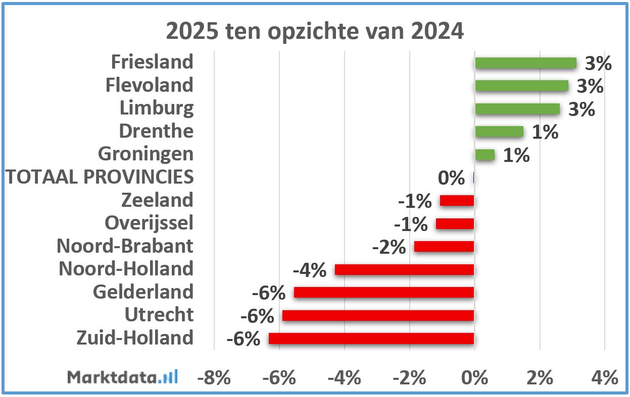 Welke provincies zagen het zoekvolume het sterkst groeien in het jaar 2025? Onderstaand figuur toont de procentuele mutatie van het zoekvolume in het jaar 2025 ten opzichte van het jaar 2024 van de provincies.