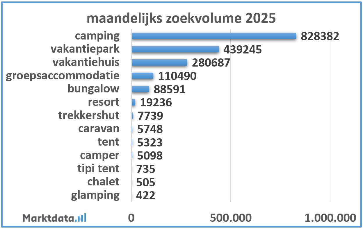 Het afgelopen jaar werd er het meest gezocht naar een camping qua accommodatievormen. Gemiddeld werd er per maand ruim 828.000 keer via de Google zoekmachine gezocht naar een camping. Dit zijn zoekopdrachten gerelateerd aan vakanties in het eigen land met de term “camping” er in. Goede tweede is het vakantiepark met maandelijks ruim 439.000 zoekopdrachten. Op de derde plaats staat het vakantiehuis.