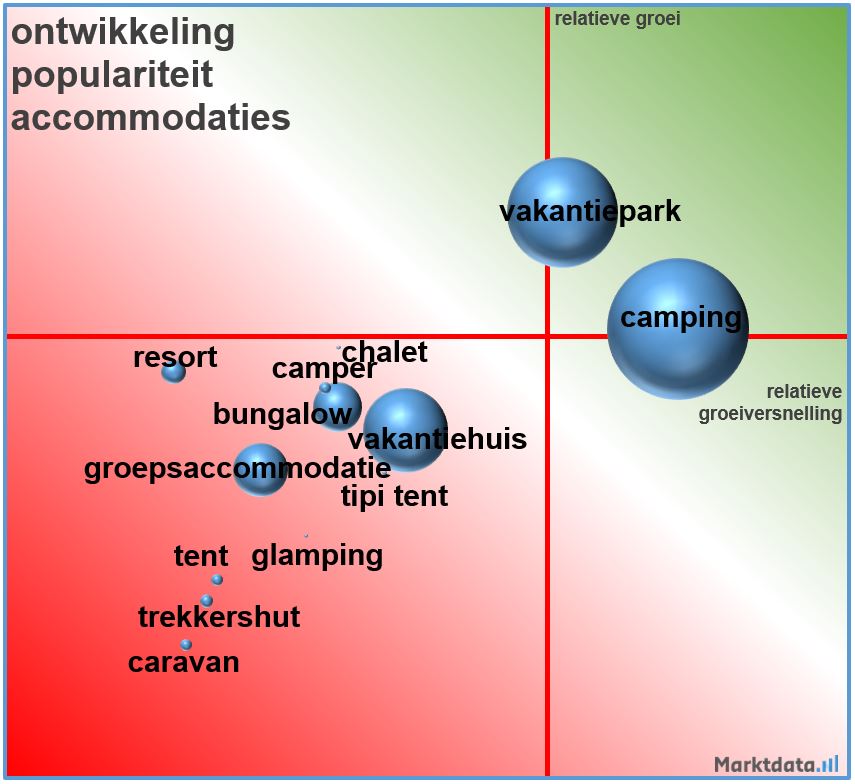 Uit het figuur blijkt dat op het gebied van soorten accommodaties het vakantiepark en de camping het sterkst zullen groeien bij de oriëntatie op een vakantieverblijf in eigen land voor de Nederlandse consument. De vooruitzichten zijn dus het meest gunstig voor de soorten accommodaties die ook nu al qua omvang het meest worden gezocht. Alle andere soorten accommodaties, zoals een vakantiehuis, bungalow of groepsaccommodatie, zitten in het minst gunstige kwadrant. De vooruitzichten voor deze soorten accommodaties zijn niet al te rooskleurig voor het komende jaar.