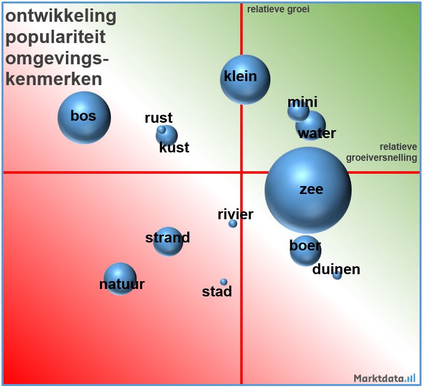 De volgende figuren geven prognoses voor het jaar 2026 op basis van intelligente extrapolatie van het online zoekgedrag van de consument over de afgelopen vier jaar. De grootte van het bolletje van een zoekterm geeft de relatieve omvang weer van het desbetreffende thema in het online zoekverkeer. Hoe meer een zoekterm bovenin het figuur staat afgebeeld, des de sterker de relatieve groei van het zoekvolume was in het jaar 2025 (dus ten opzichte van de andere zoektermen). Hoe meer de zoekterm rechts in het figuur staat, des te positiever de relatieve groeiontwikkeling is van de zoekterm. Rechts van de y-as duidt op een relatief versnellende groei, links van de y-as betekent een relatief afnemende groei. Kortom, hoe groter het bolletje en des te meer bovenin en rechts in het figuur, des te gunstiger de verwachte relatieve ontwikkeling voor de zoekterm is voor het komende jaar 2026. Het figuur toont in feite de binnenlandse vakantietrends voor het komende jaar, gebaseerd op de ontwikkelingen van de afgelopen paar jaar. De ervaring leert dat de relatieve omvang van het zoekvolume en de relatieve groei in de loop der tijd minder sterk fluctueren dan de relatieve groeiversnelling. De relatieve groeiversnelling zal namelijk niet ieder jaar versnellend kunnen zijn. Na een jaar van relatief sterke groei is de kans groot dat in het daarop volgende jaar de groei minder sterk versnelt omdat deze wordt vergeleken met de versnelling in het voorgaande jaar.