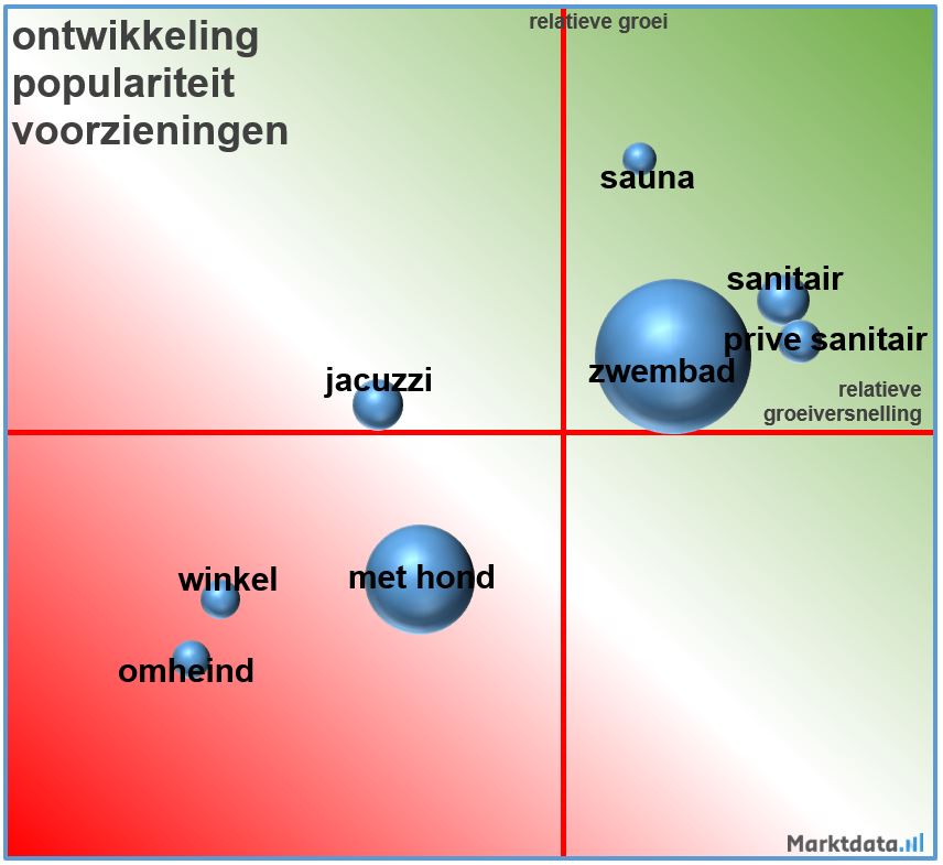 De hype van het voorgaande jaar, dat de hond mee moest kunnen op vakantie en dat men een omheinde tuin bij de accommodatie wilde hebben is weer overgewaaid. Als we kijken naar een aantal veel gezochte voorzieningen bij een vakantie in eigen land, dan valt op dat de consument in toenemende mate zoekt naar een vakantie accommodatie met (privé-)sanitair, sauna en/of zwembad. Het zwembad is veruit de meest gezochte voorziening bij een accommodatie. Het (privé-)sanitair kent de sterkste relatieve groeiversnelling. De sauna kent de sterkste relatieve groei. De consument kent een relatief afnemende interesse in een accommodatie die geschikt moet zijn voor een hond, omheind is en/of een (camping-)winkel bij de accommodatie.