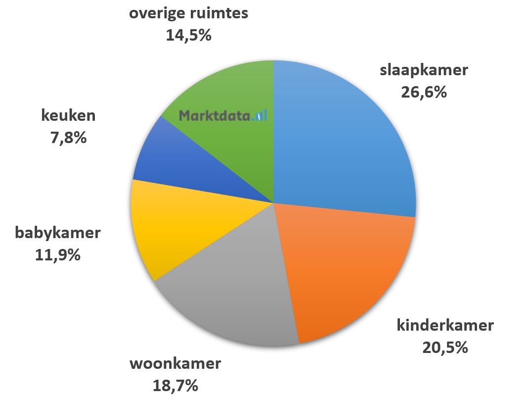 Op de tweede plaats staat de kinderkamer met een aandeel van 20,5 procent in het zoekvolume.