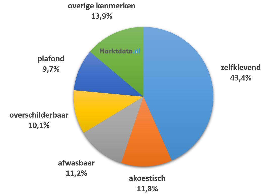 Ruim 43 procent van het zoekvolume met overige productkenmerk-aanduiding heeft betrekking op zelfklevend behang. Op de tweede plaats staat akoestisch met een aandeel van bijna 12 procent in het zoekvolume. De nummer drie is afwasbaar behang, welke 11,2 procent van het zoekvolume vertegenwoordigt. De top vijf van overige producteigenschappen wordt gecompleteerd door overschilderbaar behang en behang dat geschikt is voor op het plafond.