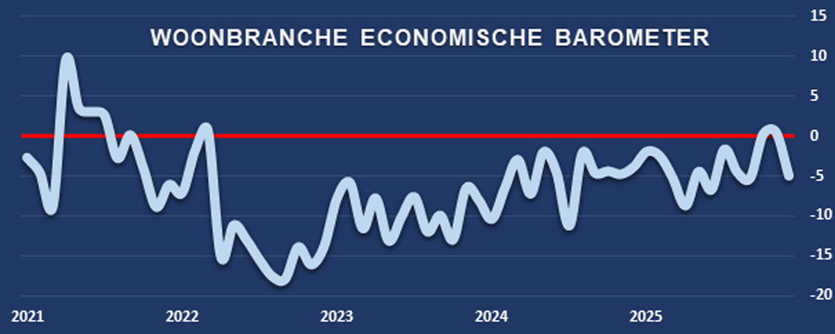 Na twee positieve maanden moest de woonbranche economische barometer in de afgelopen maand december terrein prijsgeven waardoor het jaar 2025 toch in de rode cijfers is afgesloten. De barometerstand daalde in de maand december met 5,5 punten ten opzichte van de voorgaande maand. Daarmee komt de woonbranche economische barometer eind december uit op een stand van -4,9. De forse daling wordt met name veroorzaakt door minder positieve cijfers over de woningmarkt. Maar ook de cijfers over de omzetontwikkeling van woondetaillisten dragen bij aan de daling van de barometerstand.