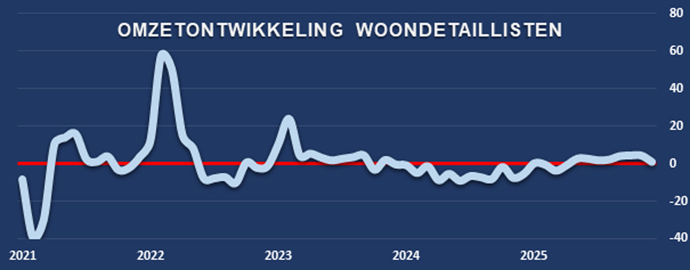 Woonwinkels (winkels in meubels, verlichtingsartikelen en artikelen voor woninginrichting met een algemeen assortiment) noteerden in november een groei van de omzetwaarde van 1,0 procent ten opzichte van dezelfde periode een jaar eerder volgens het CBS. De omzetgroei werd zowel veroorzaakt door een hoger prijsniveau als een hoger verkoopvolume. Het verkoopvolume nam met 0,8 procent toe. De omzetgroei was een maand eerder echter aanzienlijk sterker.