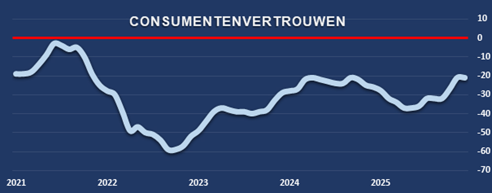 Het vertrouwen van consumenten is in december even negatief als een maand eerder, meldt het Centraal Bureau voor de Statistiek (CBS). Het consumentenvertrouwen blijft in december staan op -21. Consumenten zijn in december iets negatiever over de economie dan in november. De deelindicator economisch klimaat daalt van -34 naar -35. Het oordeel over de economische situatie in de afgelopen 12 maanden verbetert iets, terwijl het oordeel over de economische situatie in de komende twaalf maanden verslechtert. Consumenten vinden de tijd voor het doen van grote aankopen in december wel een fractie minder ongunstig dan in november.