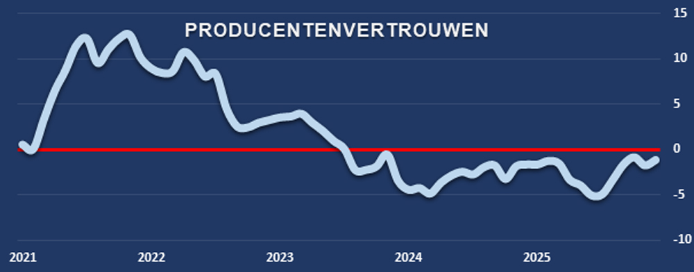 Producenten zijn in december iets minder negatief dan een maand eerder. Het producentenvertrouwen industrie gaat van –1,7 in november naar -1,1 in december, aldus het Centraal Bureau voor de Statistiek (CBS). Producenten zijn een fractie minder negatiever over de voorraden gereed product en over de orderpositie. Het oordeel over de verwachte bedrijvigheid is gelijk gebleven. Een deelindicator is positief. Het aantal producenten dat verwacht dat hun productie de komende drie maanden zal toenemen is groter dan het aantal dat een afname van de productie voorziet. De andere twee deelindicatoren van het producentenvertrouwen zijn negatief. Het aantal producenten dat de orderpositie groot acht, is kleiner dan het aantal dat de orderportefeuille klein vindt, gelet op de tijd van het jaar. Het aantal producenten dat de voorraad eindproduct als klein beschouwt, is kleiner dan het aantal dat de voorraden groot vindt.