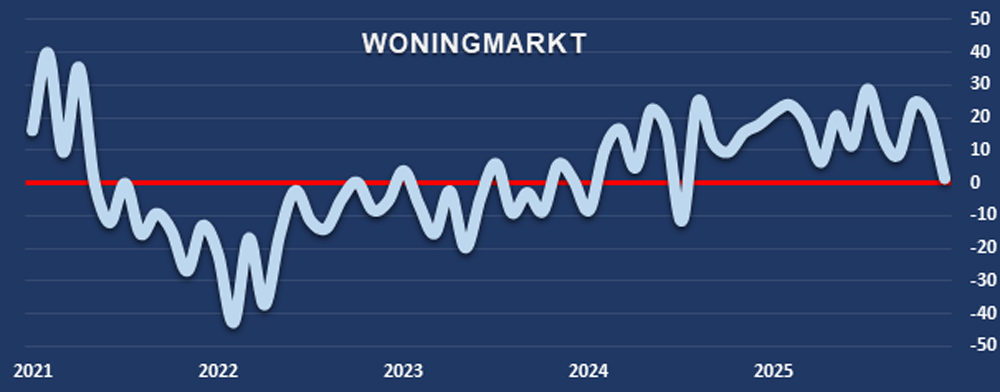 In november 2025 zijn er volgens cijfers van het CBS en het Kadaster 18.224 bestaande koopwoningen verkocht. Dat is 1,4 procent meer dan in dezelfde periode een jaar eerder. Ten opzichte van de maand oktober betreft het echter een afname van 16,6 procent. De deelindicator van de woningmarkt is van 20,5 gedaald naar 1,4. Daarmee blijft de stand van de deelindicator over de woningmarkt nog net positief, maar veroorzaakt het wel een sterke daling van de barometerstand van de woonbranche.
