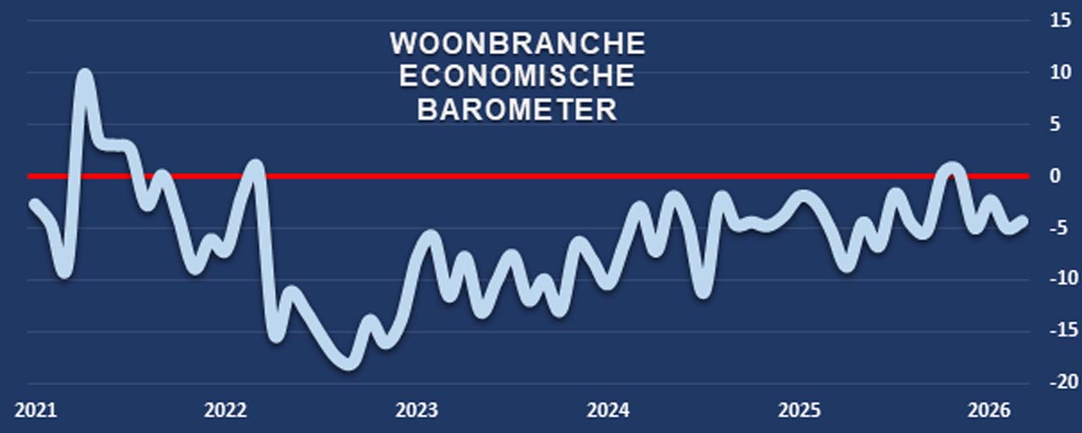 De woonbranche economische barometer is zoekende naar een richting; sommige deelindicatoren dalen en andere stijgen. Een teken van roerige, onzekere tijden. De barometerstand steeg in de maand maart per saldo een fractie met 0,6 punten ten opzichte van de voorgaande maand. Daarmee komt de woonbranche economische barometer eind maart uit op een stand van -4,3. Een scherpe daling zien we bij het consumentenvertrouwen. De omzetontwikkeling van de woondetaillist laat juist een opleving zien.