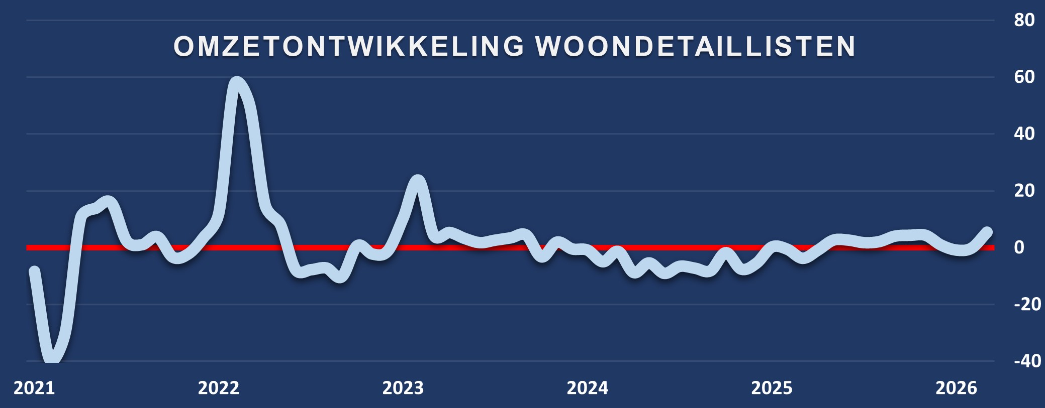 Woonwinkels (winkels in meubels, verlichtingsartikelen en artikelen voor woninginrichting met een algemeen assortiment) noteerden in februari een groei van de omzetwaarde van 5,5 procent ten opzichte van dezelfde periode een jaar eerder volgens het CBS. De omzetgroei werd voor een groot deel veroorzaakt door een hoger verkoopvolume. Het verkoopvolume nam met 4,3 procent toe. Het prijsniveau steeg licht.