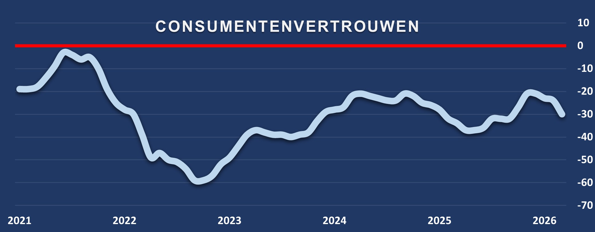 Het vertrouwen van consumenten verslechtert in maart verder, meldt het Centraal Bureau voor de Statistiek (CBS). Het consumentenvertrouwen gaat van -24 in februari naar -30 in maart. Dat is de grootste daling in bijna vier jaar. Vooral het oordeel over het economisch klimaat verslechtert. Consumenten zijn in maart negatiever over de economie dan in februari. De deelindicator economisch klimaat daalt fors van -42 naar -54. Vooral het oordeel over de economische situatie in de komende twaalf maanden verslechtert, maar ook het oordeel over de economische situatie in de afgelopen twaalf maanden is negatiever. De koopbereidheid is in maart -15, tegen -11 in februari. Zowel het oordeel over de financiële situatie in de afgelopen twaalf maanden als het oordeel over de financiële situatie in de komende twaalf maanden verslechtert. Ook vinden consumenten de tijd voor het doen van grote aankopen in maart ongunstiger dan in februari.